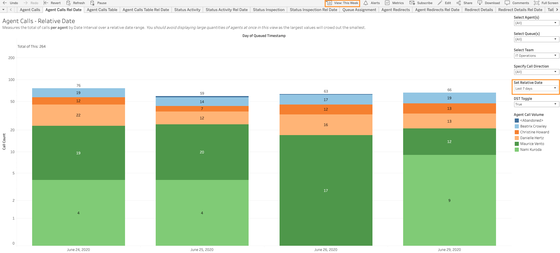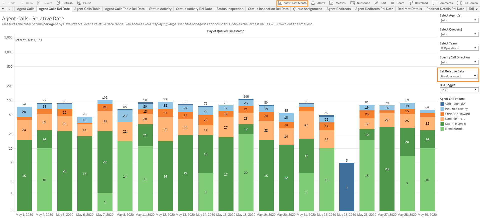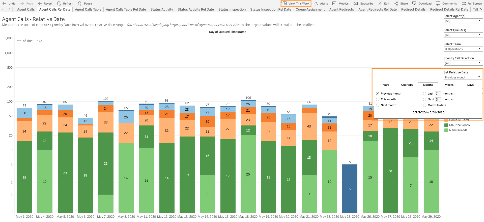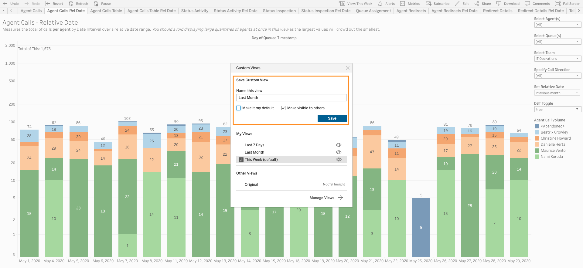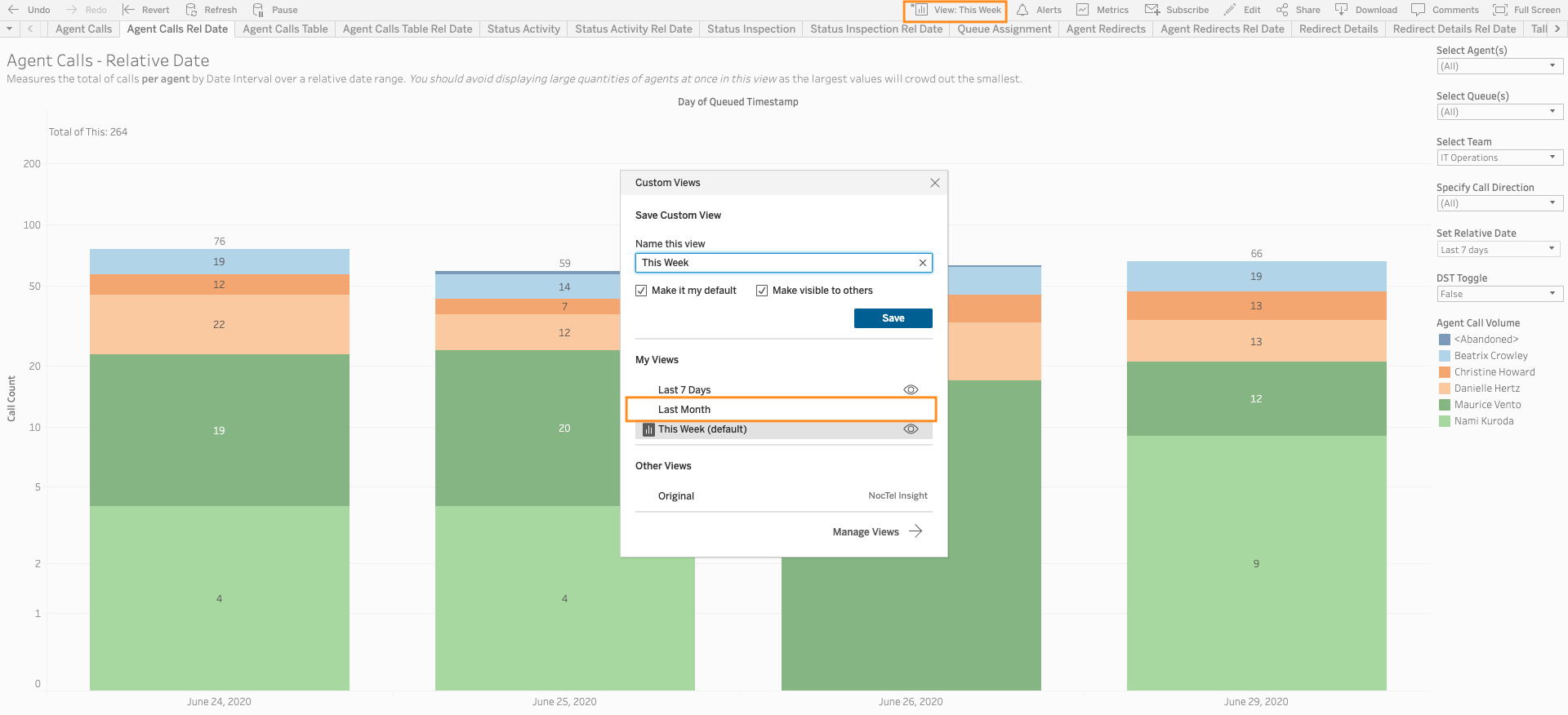 When you save a View, NocTel Insight notes all the filter, parameter, and date range settings you applied to all reports within a Workbook. Be aware that due to the synchronization that occurs between many filters and parameters in reports, the Date Range or Relative Date you most recently set in a report will be the one applied.