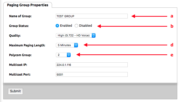 NOTE: A paging group number must be assigned to the paging group! - Multicast IP: We recommend not changing this setting. In most use cases no change is required here unless you are doing advance routing changes. These should only be changed with the guidance of your network administrator.