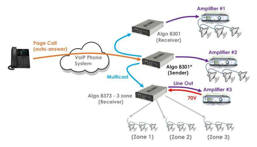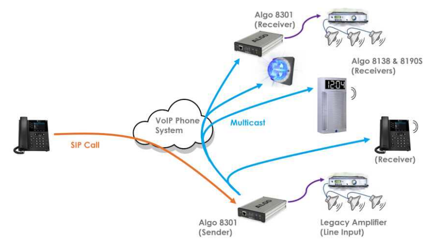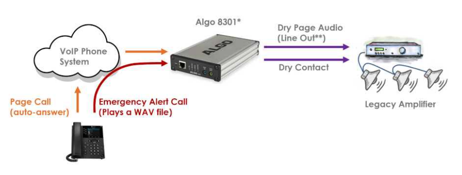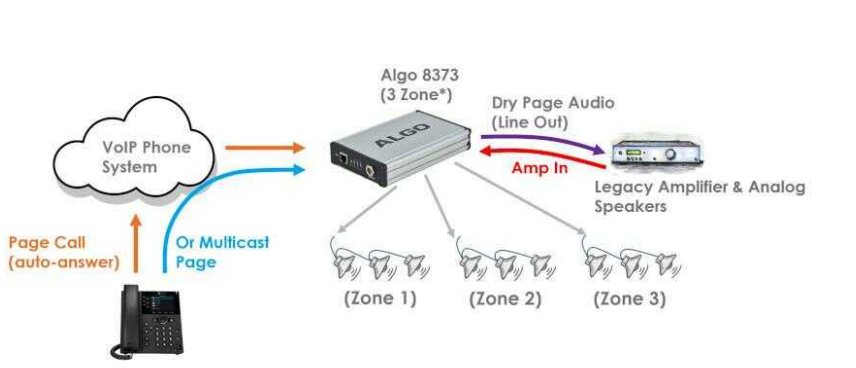 An Algo 8301 can also be used in a hybrid deployment environment. This case uses a combination of Ploycom phones, Algo speakers, and an 8301 adaptor connecting a legacy analog system, to create a cohesive paging system that bridges old and new. This is a great option for cases that are looking to replace a dying analog system but might need to bridge a longer transition period.