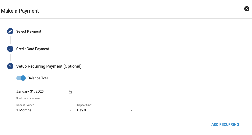 Click the ADD RECURRING button in the bottom right. The screen will update to the current payment history page. This section will be blank if this is your first time setting up recurring payments.