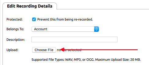 NOTE: Supported file types are WAV, MP3, or OGG. Maximum Upload Size is 20 MB. - When your recording details are complete, make sure to press 'Submit' to save your changes.