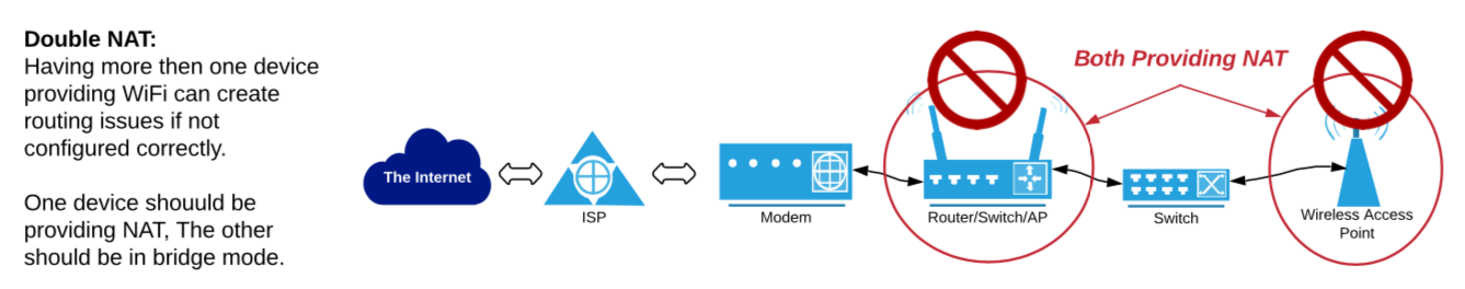 Double NAT often happens when your ISP provided equipment is acting as a router and proving NAT and a second router device is installed behind it. Another common double NAT occurrence happens when users add Wi-Fi access to their network. Most consumer networking devices are combo devices, part router, switch, and Wi-Fi access point; when adding these to your network in addition to a router already in place, it is important that the device is configured in what is commonly known as “bridge mode”. This configuration disables the NAT feature of the device and allows the main router to function as the DHCP server without an IP address conflict, eliminating Double NAT.