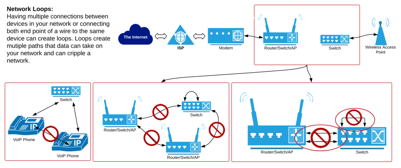 The more complex a network is the more opportunity for errors to be introduced and if your network equipment is not in a secure area and non-technical users have access to it they may accidentally introduce a loop which can cripple a network. A loop is created when a device is connected back to itself or two switches are connected via more than one connection. With most residential/entry level routers or switches, a loop will cause the network to not function. To correct the issue, the connection causing the loop will need to be found and removed.