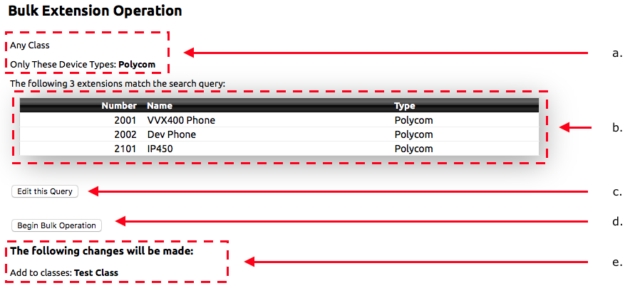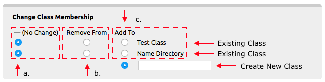 Change Class Membership: Allows for the selected extensions to be added or remove from a class. The classes in the account are listed with three options; No Change, Remove From, and Add To. There is also a text box under Add To where a new class can be created.