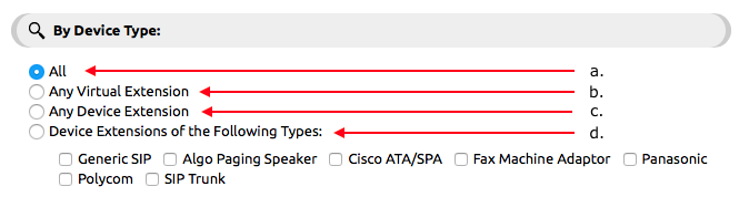 By Device Type: Use to filter a set of devices based on the extension type. You can use this area to limit the criteria to a certain type of extension device or to include all types.