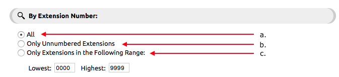 By Extension Number: Use to filter a set of extensions based on their numbers. Example: your account may have phones at different sites; Site A may have extension numbers 200-299 while site B may have extension numbered 300-399.