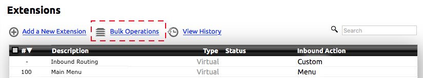 When dealing with large amounts of extensions, NocTel's Bulk Operations tools can significantly reduce the time needed to manage your account. The Bulk Extension Operation is located on the Extensions page of the control panel. When on the Extensions' main page, look for the Bulk Operations link located above the extension table.