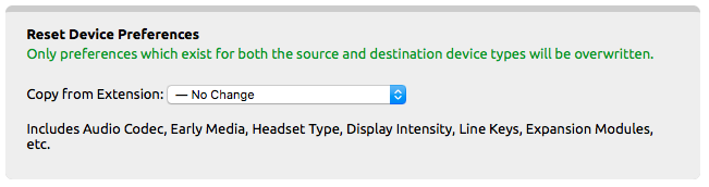 Reset Device Preferences: Uses an extension selected from the drop-down box as the template for changing the device preferences for the other extension to match.