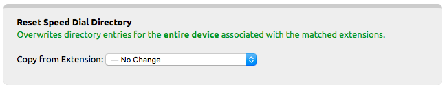 Reset Speed Dial Directory: Uses an extension selected from the drop-down box as the template for changing the extensions speed dial presets to match. An individual extension’s speed dials can be set by going to an extensions page and clicking the Speed Dial Directory link below the extensions number and name.
