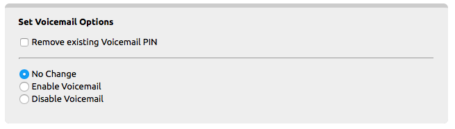Set Voicemail Options: Use to remove Voicemail pin and/or enable/disable Voicemail.