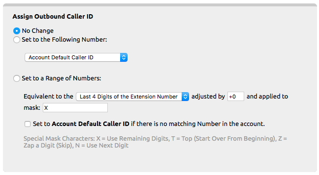 Using the Set to a Range of Numbers options allows for the outbound caller ID to be set to a matching DID. For example, if you have extensions in a 1001-1099 range with DID in the xxx.xxx.1001 to xxx.xxx.1099 range. This function can be used to match the DID with the extension for its caller ID.