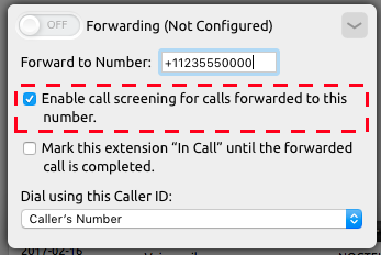 - Click the check box for Enable call screening for calls forwarded to this number. This feature is recommended to be enabled, in case the extension is used as a part of a hunt group or menu option within another extension. If this option is not selected and a call is forwarded and picked up by the forwarded number voicemail, the call will no long be controlled by the inbound behavior of the preceding extension.