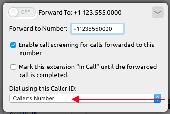 - You can change caller ID for the forwarded call by using the drop-down box under Dial using this Caller ID. Any number listed in the account can be selected for the forwarded call’s caller ID. Default is set to use the Caller’s Number, this will use the dialing party’s caller ID when forwarding the call.