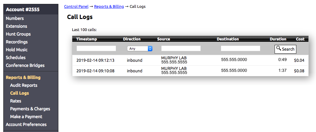 Call logs are found under Reports & Billing in the main control panel menu. The Call Log page shows the last 100 calls for the account. The Call Log page has search capabilities that allow users to query older logs up to 90 days. Clicking on a call in the log list will load the log's detailed page that contains further information on the call.