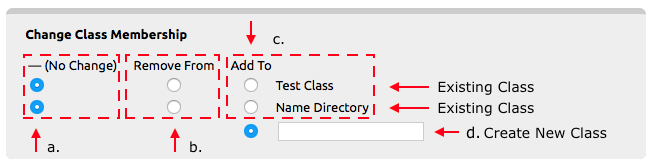 - Once the criteria for the selected extensions is set, use the area labeled Change Class Membership to edit the selected extensions class assignments. The existing classes in the account are listed with three options; No Change, Remove From, and Add To. There is also a text box under Add To where a new class can be created.