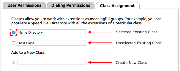- The Class Assignment tab will show a list of classes that are established within the account along with a checkbox to indicate if that class is applied to the number. Existing classes can be applied or unapplied by clicking the checkbox next to the class name. A blue checkmark indicates the class will be applied. If adding the number to a new class, use the text box located below the Add to a New Class section.