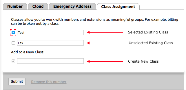 Classes are a great way to help label, sort, and organize extension and numbers within an account. Classes can be assigned individually to number, extension or with the use of the Bulk Operations assigned to groups.