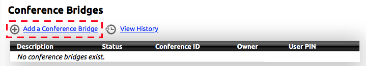 - The Conference Bridges page will list any bridges that have been previously created in the account. Click the "Add a Conference Bridges” link above the list to create a new bridge and open the Conference Bridge Editor.