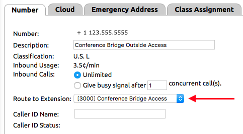 To allow users to access a conference bridge a number within the account must be routed to the controlling extension for the conference bridge. To do this: