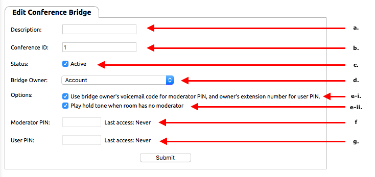 Repeat the above steps any time a new conference bridge needs to be made. Existing bridges can also be edited by click on the bridge within the list on the Conference Bridges page. Click submit anytime changes are made that need to be saved. To use a bridge the account needs to have at least one controlling extension that is used to connect to the conference center.