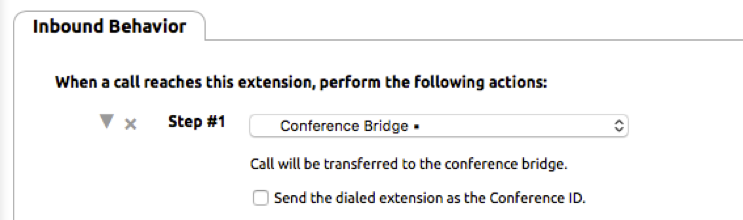 - In the inbound behavior set Step #1 to Conference Bridge using the drop-down list.