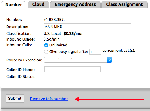 On the Number tab click the “Remove this number” link located next to the Submit button. If the link is blue you can delete the number immediately as it is not used elsewhere in the account.