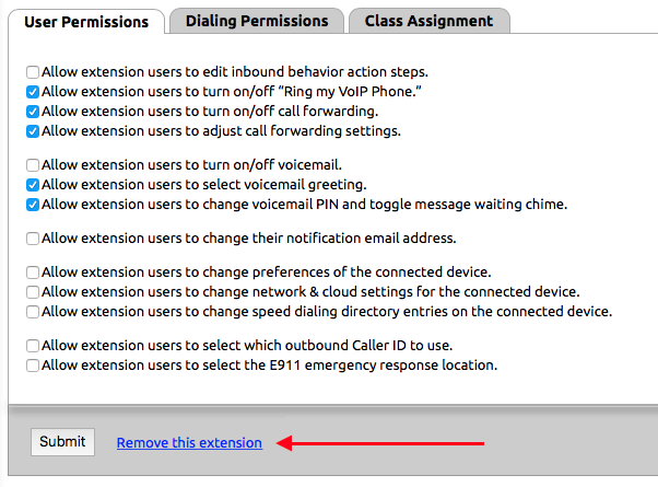 - On the User Permission tab click the “Remove this extension” link located next to the Submit button. If the link is blue, you can delete the extension immediately as it is not used elsewhere in the account.