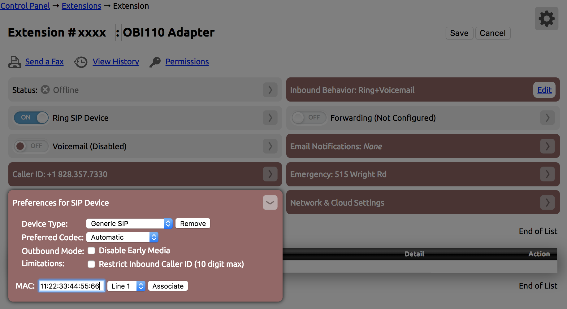 Before the OBI110 can be configured for deployment, it must first be added as a generic SIP device extension in your NocTel account: