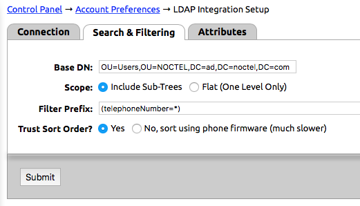 Filter Prefix: This enables filtering of which records should show up. In our example (telephoneNumber=*) this means anything that has a telephoneNumber will appear.