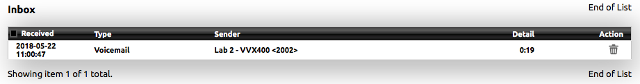 Voicemails can also be deleted from the control panel. Click the trash can icon next to any voicemail to remove it. Once deleted the voicemail cannot be retrieved.