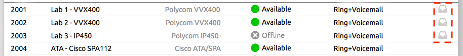 - In the list of extensions you will see extension with a mailbox icon. These are extensions with voicemail enabled.