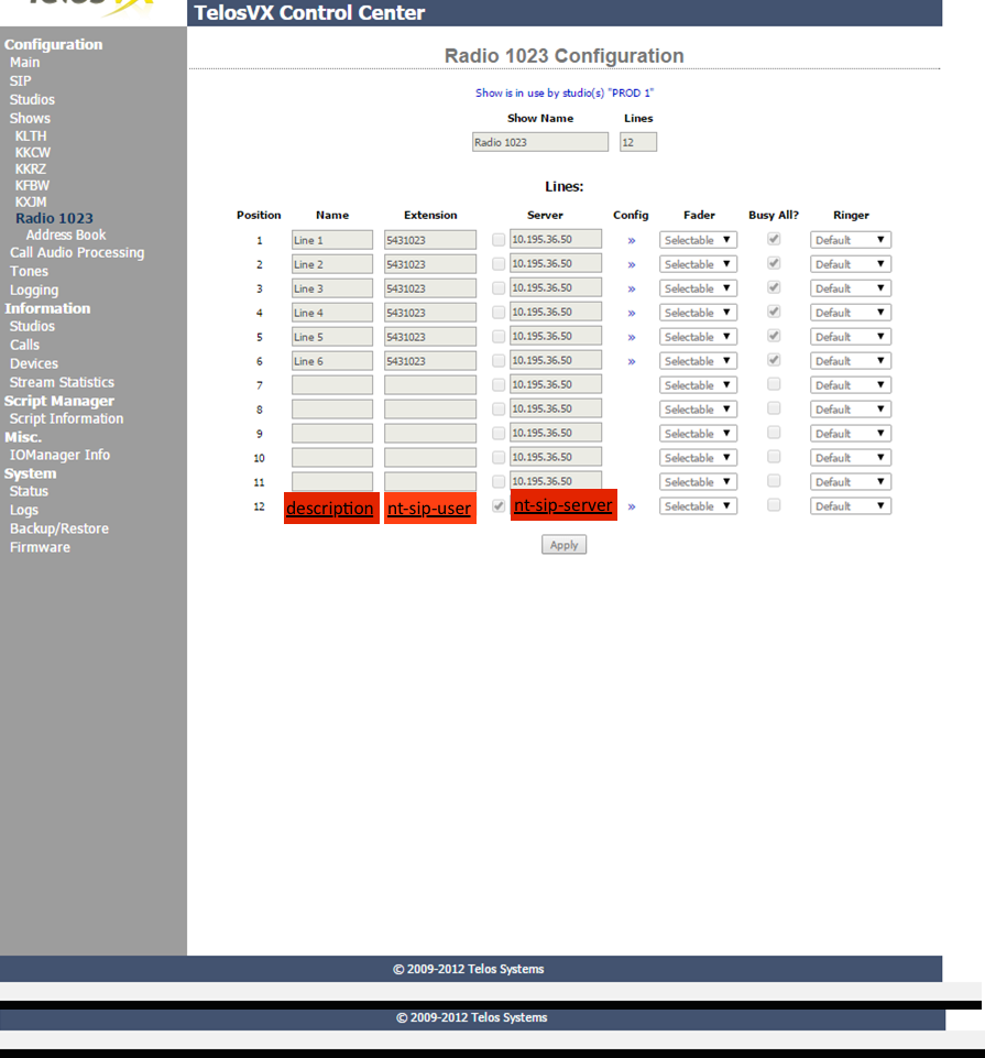 - You will then need to add a show which uses the SIP trunk you have defined in the last step. Under Configuration -> Shows. Select an existing show or create a new one and then on the positions you wish the call to appear, specify a description, the SIP User and SIP Host from above.