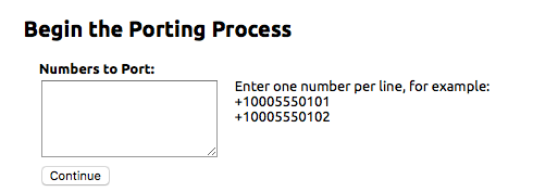 4. At the bottom of the page in the “Number to Port” section enter the numbers you wish to port. Include +1 at the beginning of the number and leave out all dash or dots.  Example: +15551230000. You can request multiple numbers to be ported, but each number must be located on its own line within the text box.