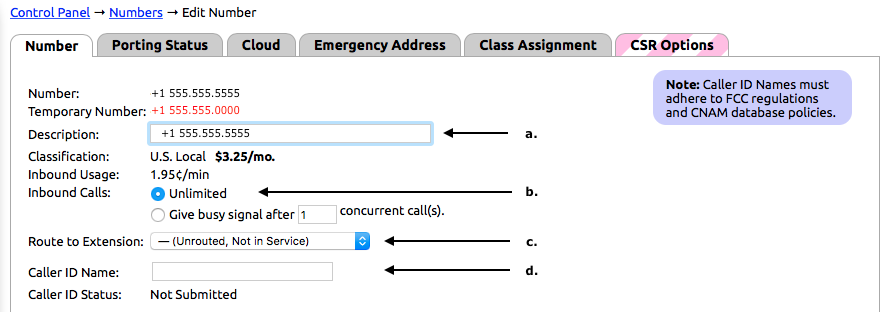 Within the numbers edit page on the Number tab the following items can be changed (click submit to save changes):