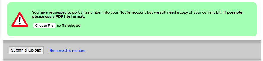 7. Below the options for the number, in the green area, is where you will need to upload a PDF version of your latest bill, on which the number appears. Click Choose File and navigate to the file on your computer.