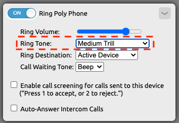 Turning the Ring Poly Phone toggle off will stop all inbound calls from reaching the device. The phone will not audibly ring nor will the inbound call appear on the phone. To the inbound caller, the phone will still appear to ring, before moving on to the next step in the inbound behavior. An extension set to the silent tone option will display incoming calls on the desk phone's screen with no audible tone/ring.