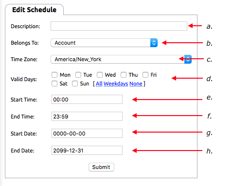 - BelongsTo: using this you can assign the schedule to a specific extension. Most users should leave this set to Account. When this is configured as a specific user, users with rights to that extension can modify the schedule when they log into the control panel.