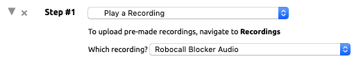 - Set Step 1 to “Play a recording” and select the recording you created from the drop-down list.
