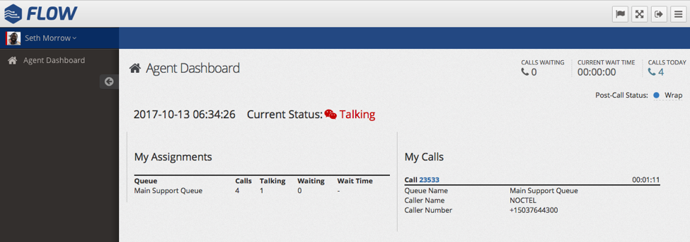 The Agent Dashboard is the user level agent’s main work area within Flow. From the Agent Dashboard, an Agent can change their status, see general information about the Queues they are assigned to, update their activity, and see Screen Pop information related to the call if enabled. Do note that some web browsers or installed plugins to web browser may cause Screen Pops to not be blocked. Please ensure that agent web browser(s) used with Flow always allow pop-ups from Flow. The Dashboard also reminds the Agent to connect to an extension if they have forgotten to do so at their workstation prior to logging into Flow.