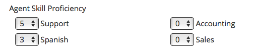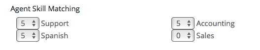 The Skills that a Queue will try to match are set in the Queue Edit page, or the New Queue page if setting up a new Queue. A list of all skills for the account will be shown under the Agent Skill Matching section. Each skill proficiency can be set using the drop-down list next to it.