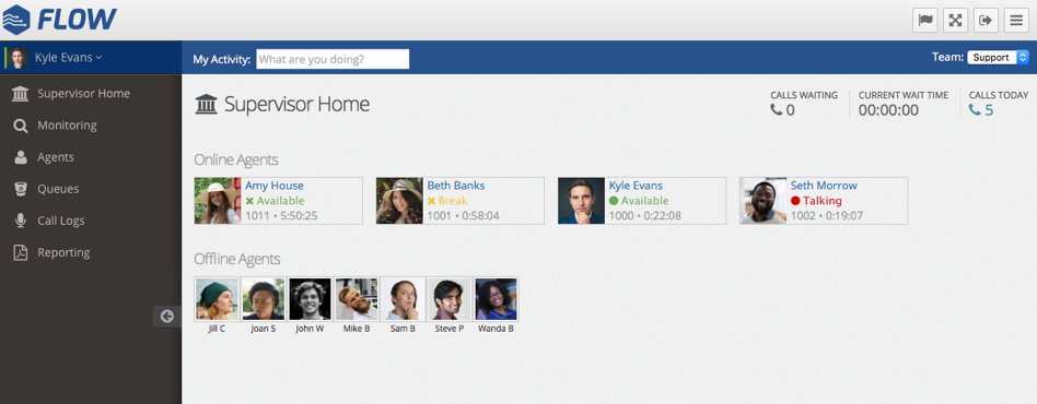 The Supervisor Home gives Supervisor users access to tools they need to oversee Queues and Agents. The main Home page gives an overview of what is happening in the account including information about Queues, Online, and Offline Agents and their Team history. Supervisors also have access to the Monitoring section over flow that give details on current Queue status.