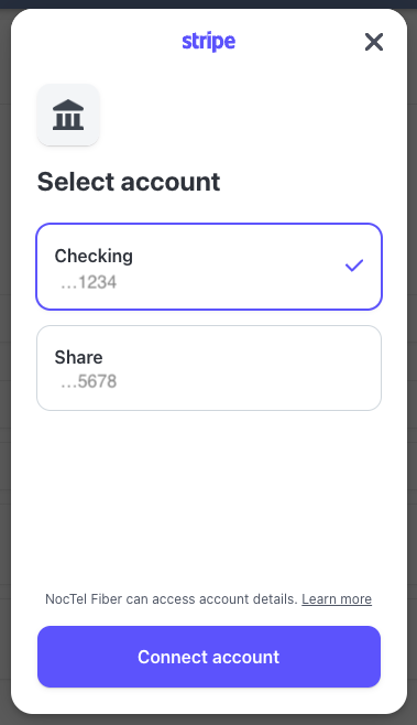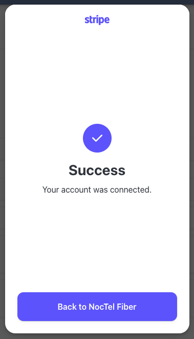 Click the Back to NocTel Fiber button to continue setup.Your bank account info will now be displayed on the NocTel Fiber Portal Make a Payment page (shown below).