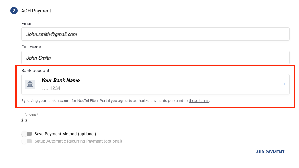 Use this guide to make a payment from your bank with ACH in the NocTel Fiber Customer Portal.
