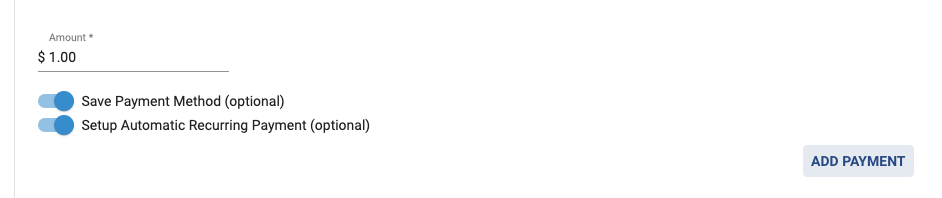 Note: Both the Save Payment Method and the Setup Automatic Payment silder must be on for setting up recurring payments. - Click the ADD PAYMENT Button. The screen will update. Step 3 Setup Recurring Payment will not be visible.