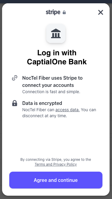 - A pop-up window will appear requesting, you to log in to your bank. Click the blue Agree and Continue button.
