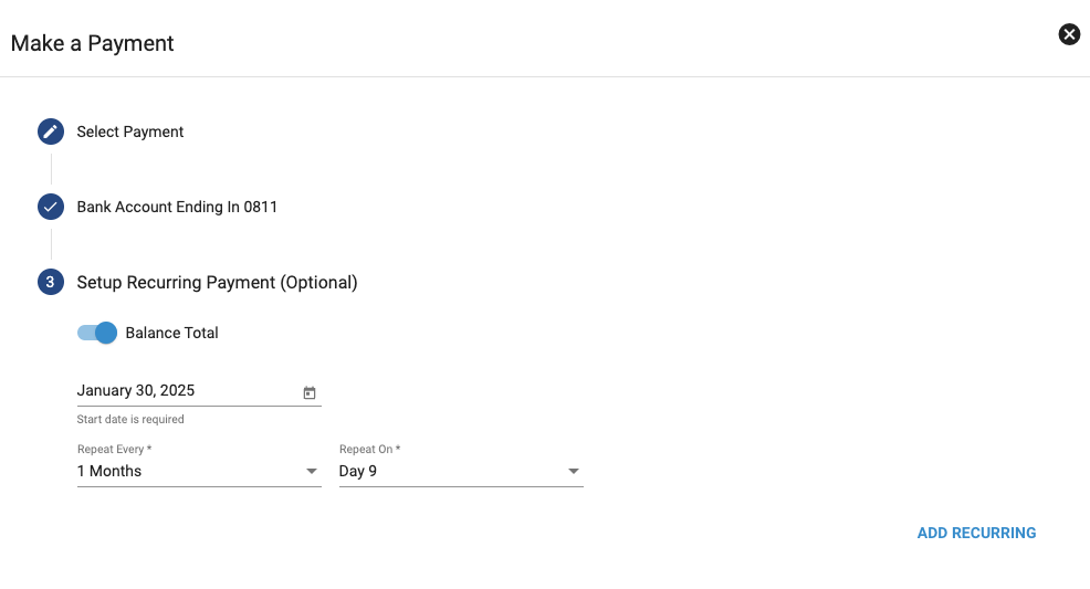 Click the ADD RECURRING button in the bottom right. The screen will update to the current payment history page. This section will be blank if this is your first time setting up recurring payments.
