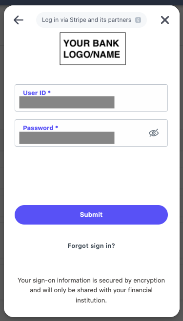 - The pop-up window will display a login for your bank. Enter the User ID and Password you use to access your online banking account.