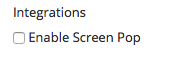 9. Under Integrations you can enable the Screen Pop feature by checking the box. Screen Pops allow for visual information from the call to be displayed to the agent if the queue the call is coming from has been enabled to send screen pop information.