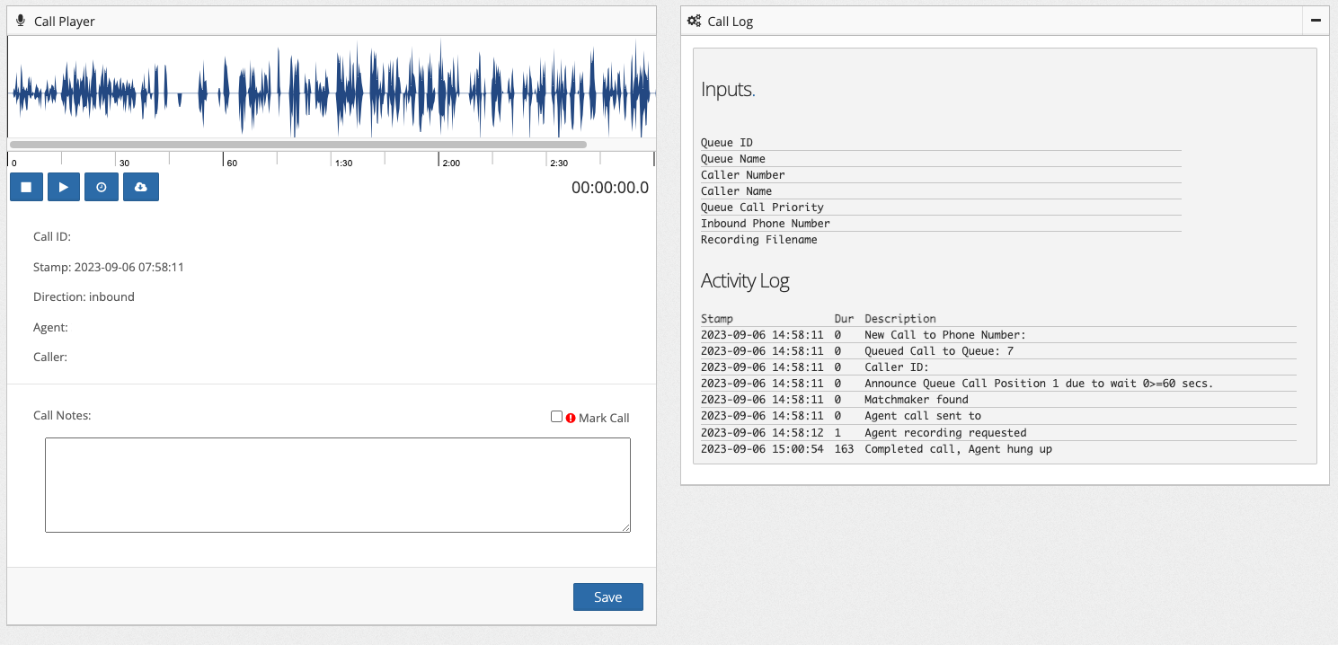 - View call information: Call ID, Stamp, Agent, and Caller ID.