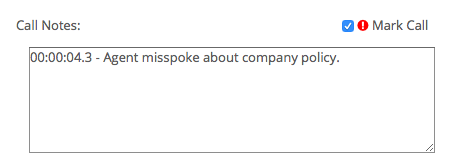 Within the logs detailed page, a user can make notes in the Call Notes section by using the Timestamp Button or shortcut key or by typing in a note. Calls can also be marked by using the Mark Call Checkbox. Checking the box allows the call to be searchable in the Call Logs main page as a marked call. When finished adding notes to the call, the user needs to press the Save button to save the new info to the Call Log.